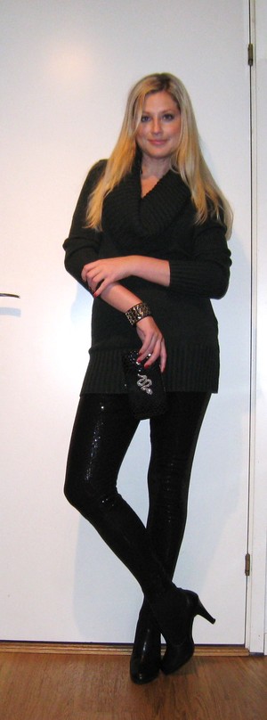 Hello Citycatbabes! Det här hade jag på mig igår på glöggmyset hos min arbetskamarat som jag kom iväg på trots allt. Det var verkligen fantastiskt trevligt så jag är så glad att jag gick dit! Så vad har man på sig på glöggmys när det är minusgrader ute, lite mys i form en den nya stickade tröjan från HM och lite festligt i form av de nya paljettleggingsen från HM (med ullstrumpbyxor under) och min lilla ormclutch med gnistrande stenar. 🙂 Idag vaknade jag upp förkyld, trist och jag som har så mycket jag behöver göra de närmsta dagarna, men det är inget att göra åt, hoppas det hinner gå över till julafton bara, men det ska det väl göra! 🙂 Hoppas att ni frå en bra tisdag! Citycatkisses!